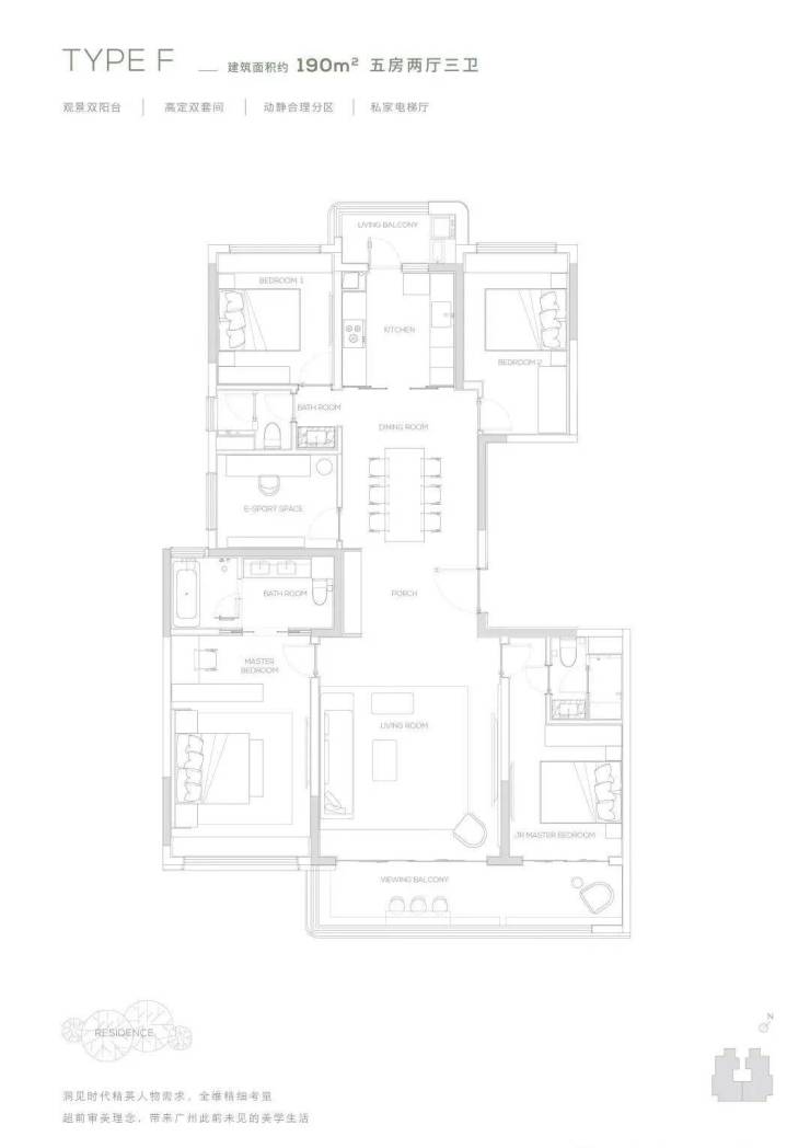 190产品为五房两厅三卫产品,充满了对云端人群生活的独特见解,南向双主卧,中西厨布局,打造纵向超长LDK一体化空间,产品所体现的不只是居住产品,更是特属客群所拥有的生活方式。