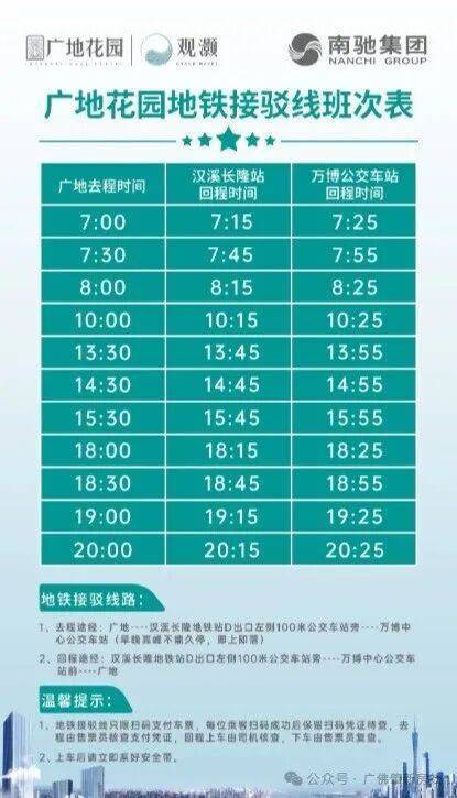 也有专线接驳地铁南村万博站(7分钟)和汉溪长隆站(10分钟),可乘坐地铁3-7-18号线。