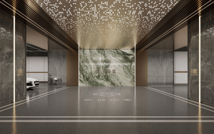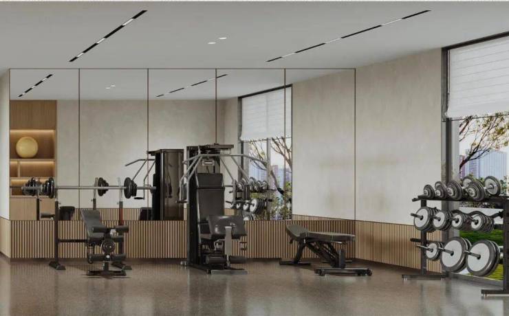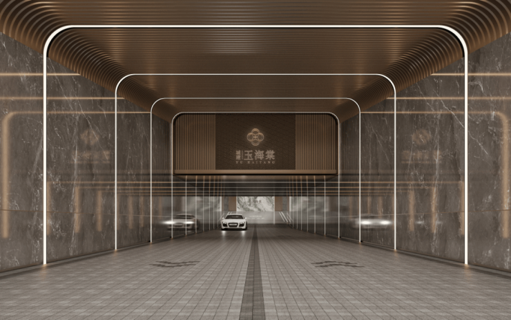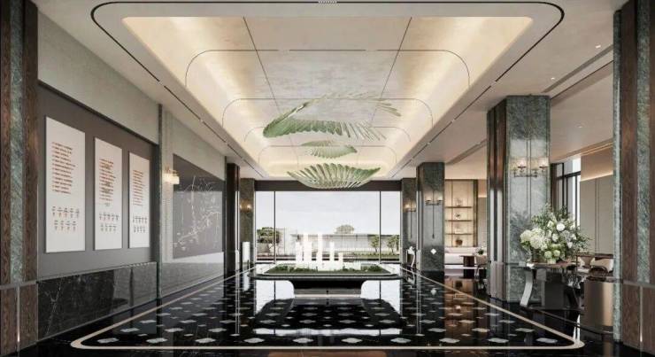 【建筑美学:现代笔法勾勒岭南风骨】建筑外立面采用三段式美学构图,底部以香槟金色铝板勾勒归家仪仗,中部通过一体板与真石漆的材质碰撞形成韵律变化,顶部借由全景落地窗实现与云天的对话。这种“层叠退台”的设计手法,既延续了余荫山房“缩龙成寸”的造园智慧,又以现代语汇重构岭南建筑表情。