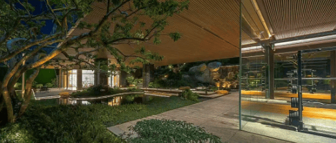 园林中设有多个功能空间,满足业主的不同需求。山水涧组团利用地势高差形成双层山林会客厅,为业主提供了一个私密的交流空间;溪山亭采用高档石材打造,营造出圈层生活美学;大区主入口庭院光影澜庭引用国外超薄膜水景设计,借山与水的互动创造别具一格的归家仪式感;林下吧台麻楝树王独木成林,华盖之下是业主午后小憩的幸福时光;草坪空间是孩子们与自然亲密接触的开阔地,也是智者养生局的起始点;青年健身区则散发着荷尔蒙的轻盈与活力,让业主在运动中释放压力,保持健康。