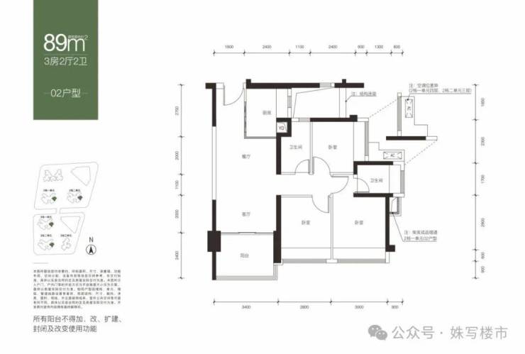 89平三房两卫,常规的竖厅格局,对比82的客厅进深更深些,餐厅面积更大,客厅开间也宽了20cm,次卧打完飘窗相当大,儿童房再也不用担心床怎么摆了。