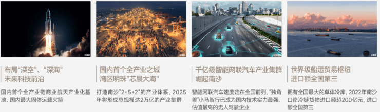🔹产业布局:南沙科技创新及高端产业集聚,以航运物流、高端制造、金融商务、科技创新、生命健康五大产业为主导,将构建“一城四区”的格局,分别为北部科创片区、南部国服航运片区和横沥岛所在的商务核心中心城区。