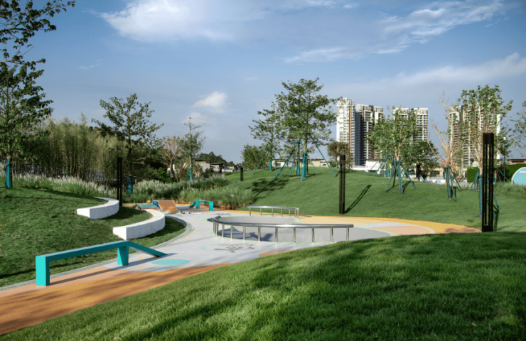 多彩的滑梯、双杠、梅花桩、蹦床等设施,构筑了一座园林游乐场,童趣臻心呵护,任由孩子们游戏笑闹,肆意探索,创造出美好的童年回忆。