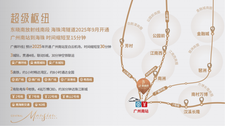 广州南站作为中国角逐世界的国际 TOD 都会、粤港澳大湾区“城市会客厅”,构建了 1 小时都会生活圈,实现核心城市互融互通提速。项目周边拥有 14 条轨道交通路网,4 条地铁(2 号线、22 号线、7 号线、佛山 2 号线)与 2 条有轨电车(南海新交通、N2 线),4 站至万博 CBD、7 站至北滘新城、30 分钟至珠江新城,广州地铁 22 号南延线将延伸至深圳沙井站,北延线将延伸至白云机场。还有 5 条高铁(武广线、南广线、贵广线、广深港线、粤西线),8 小时辐射全国,5 小时覆盖华南商圈,48 分钟直达香港九龙。3 条城际轨道(广珠城际、广佛环城际、佛莞城际)打造 1 小时湾区都会生活圈。4 条城区快速干道,16 分钟到海珠,四通八达串联全城。