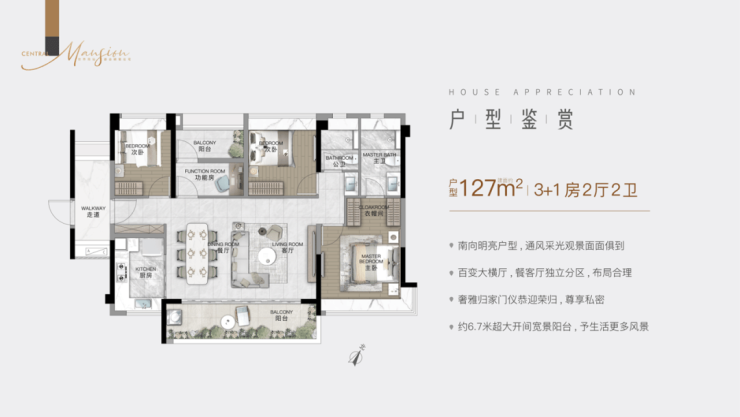 项目首推约 98 - 143㎡三至四房,多种户型满足不同家庭需求。建面约 98㎡ 2 + 1 房 2 厅 2 卫,豪华主卧套搭配超大 270 转角飘窗,超大阳台可改房间,面积赠送一半,性价比极高,三开间南向采光,约 9.8m 大尺度南向采光面,超大方厅动静分明,还有约 4m 南向主景观阳台,所有房间带飘窗。建面约 116㎡3 + 1 房 2 厅 2 卫,同样有豪华主卧套与超大转角飘窗,U 字型布局厨房操作空间环绕,三开间南向采光约 10.4m,超大赠送,超大方厅互不干扰,南向约 6.4m 长阳台且所有房间带飘窗。建面约 127㎡3 + 1 房 2 厅 2 卫(横厅),四开间南向采光约 13.2m,大面宽南向大横厅约 6.8m 面宽,多种模式切换,双面景观阳台与满飘窗实现景观资源最大化利用,还有豪华主卧套。建面约 128㎡3 + 1 房 2 厅 2 卫,双阳台对流,多段式 LDKG 超长通厅,大面宽采光面约 13.9m,超大方厅,双面景观阳台约 6.8m 面宽。建面约 143㎡3 + 1 房 2 厅 2 卫,豪华主卧套视野开阔,超大赠送,双阳台对式,多段式 LDKG 超长通厅,大面宽采光面约 14.6m,双面景观阳台约 7.5m 面宽。