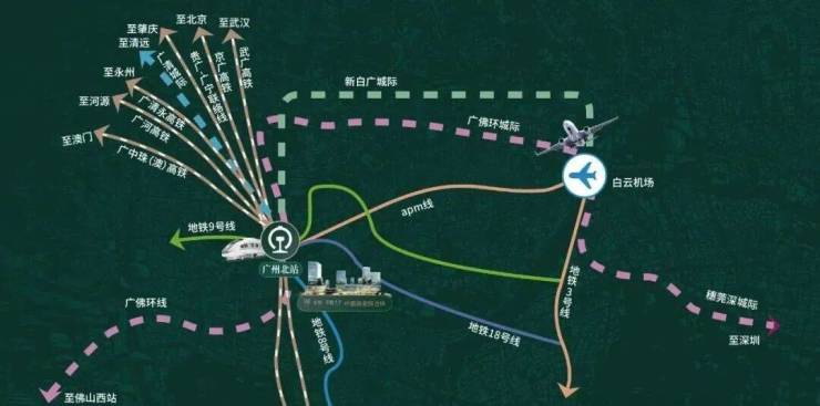 以空铁融合、站城一体规划北站商务区,构筑城市发展的向芯力;依托T4航站楼及白云机场快速APM线,实现广州北枢纽+空铁联运+商务中芯三大能级联动,打造引领珠三角、辐射中国南部、面向世界的生活中芯场域。