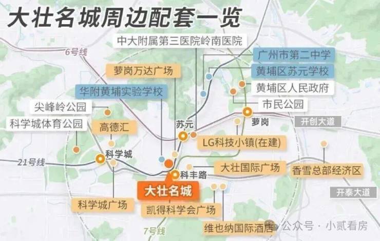 大壮名城的优点几句话就可以概括完。 科学城的核心区位。城市界面漂亮,有公园。 家门口有萝岗万达的商业配套,出门就能上开创大道或者开泰大道,这两条科学城的主干道。 三地铁交汇,6号线、7号线和21号线。有九年一贯制的华师附黄埔实验学校。 对了,除了这些,还有一个新规下,科学城首个超过百分百得房率的新房产品。留下新房韵味还没散去的一期业主,在风中凌乱。
