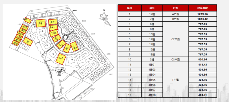 •项目当前共计17套,未售面积约9770.83㎡;其中1000㎡以上大独栋共2套,767-820㎡独栋共计8套;403-414㎡空中花园别墅共计7套;