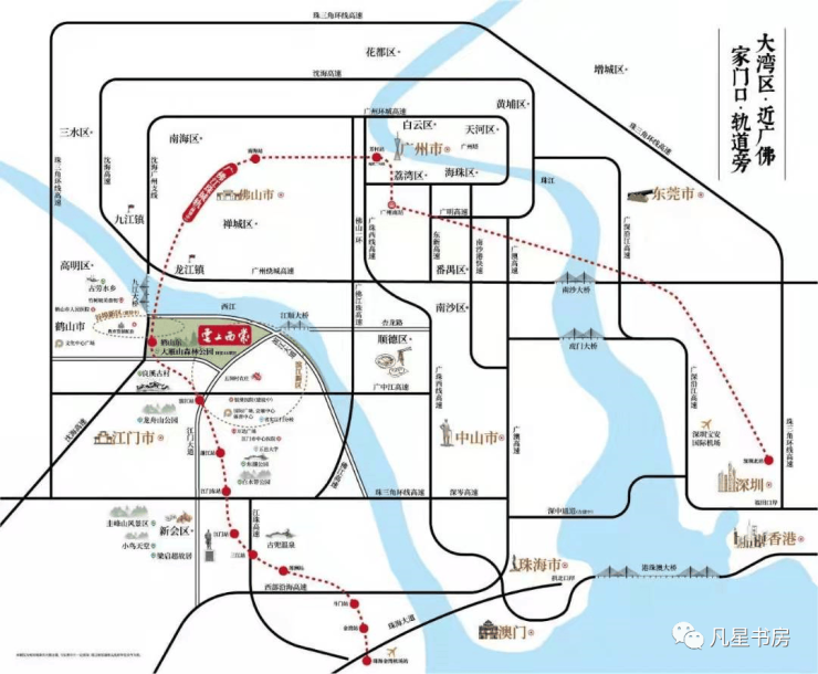 约30min=上班的时间 【广佛江珠城轨】广佛江珠城轨鹤山东站,建成后到广州约30分钟,约1小时到达珠海,无缝接驳一线城市圈。【九江+江顺大桥】广佛隔江相望,通勤仅一桥只隔——九江、江顺大桥,连接千灯湖及大良,约半小时即可。【佛开高速+滨江大道+江门大道】滨江大道双向8车道,时速可达到80公里,20分钟到达滨江新区,30分钟到达万达商圈。佛开高速(沈海高速),约5分钟接驳,约40分钟可到佛山核心千灯湖、1小时可到广州珠江新城;江门大道双向8车道,往江门方向,全程无红绿灯。