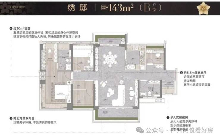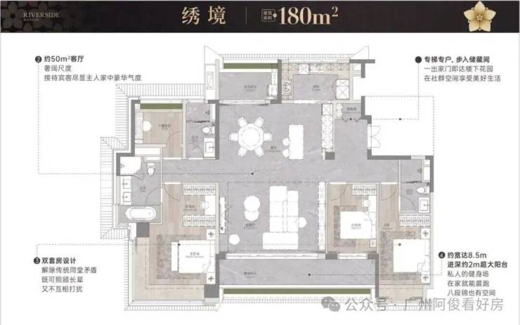 50米亲江距离:全盘仅10/11栋实现南向一线瞰江,260㎡户型配约13米IMAX级阳台,江面宽达3公里,视野优于珠江新城部分顶豪。