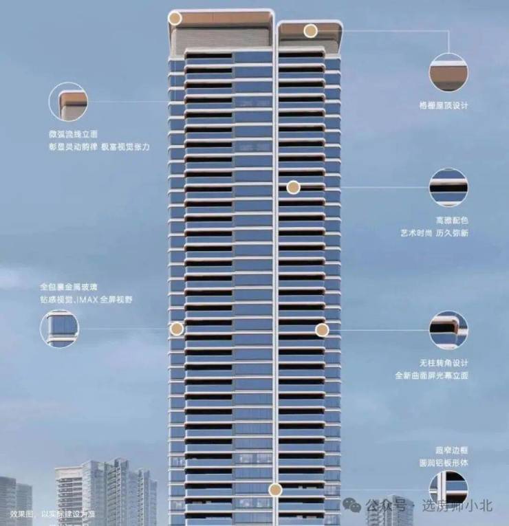 . 公建立面:公建化曲线流体设计、无柱转角弧形窗、铝板全景玻璃光幕,270°环幕视野媲美鹏瑞一号。