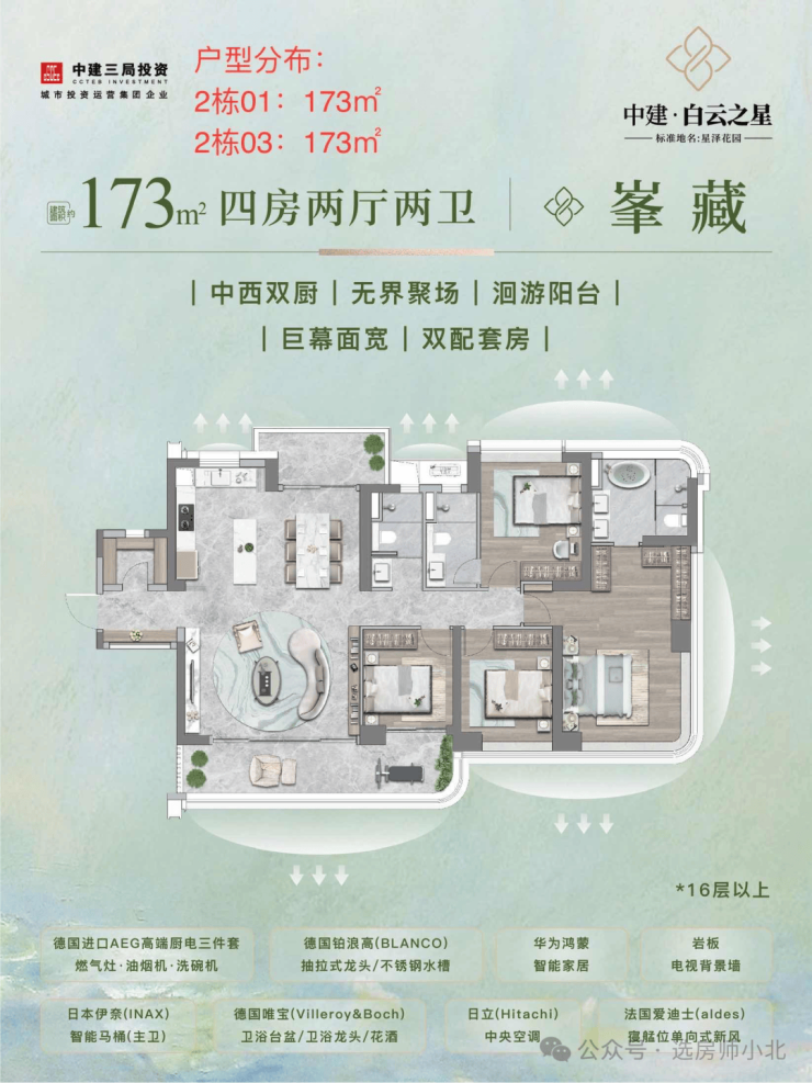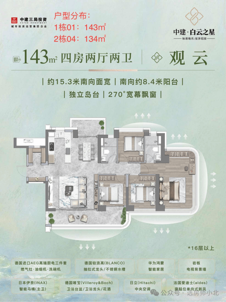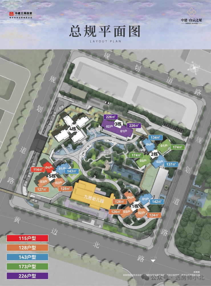 项目首开组团规划 5 栋楼,总建面约 10 万方。首次开盘推出 1、2 栋,涵盖 128㎡、143㎡、173㎡三个面积段的户型,均为 3 梯 4 户设计;中间 C 位的 3 栋是两梯两户的大平层,建面约 226