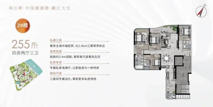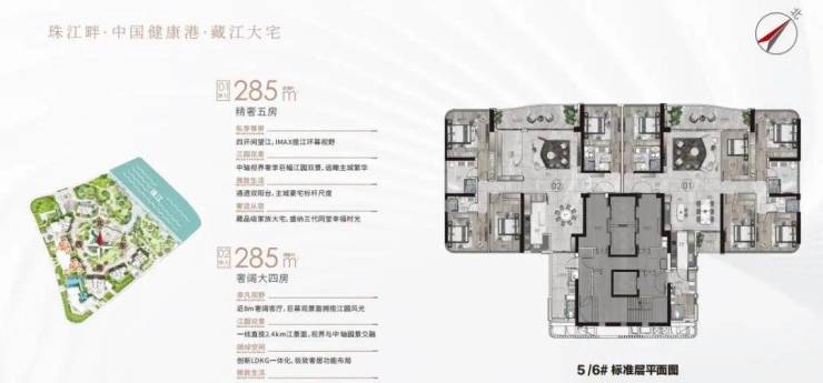 户型:建面约233-285㎡四至五房,东向/东南向一线望江,极致3.4-3.6m层高