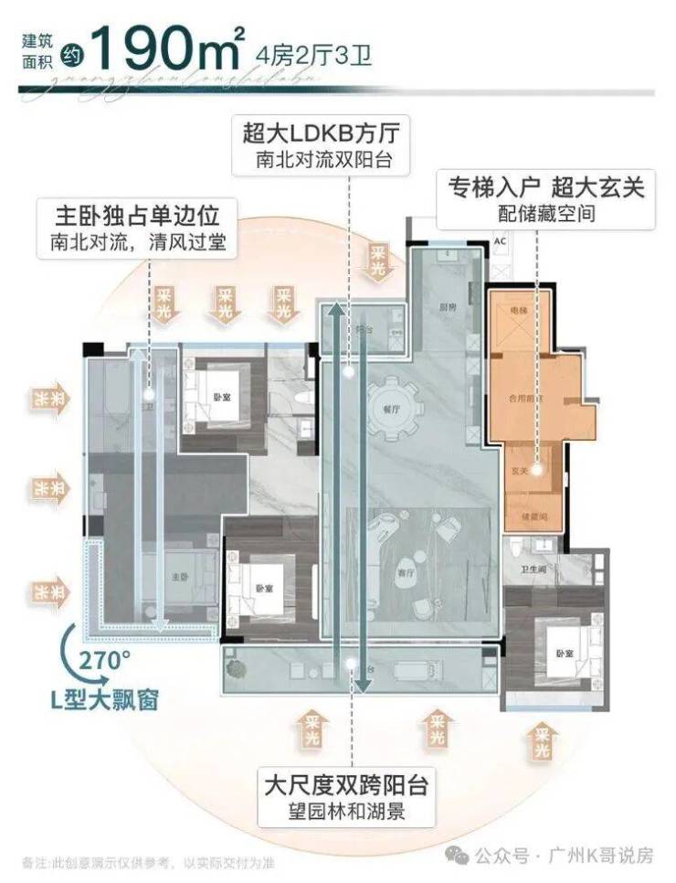 3、窗地比高达38%,主卧设置270°大飘窗。