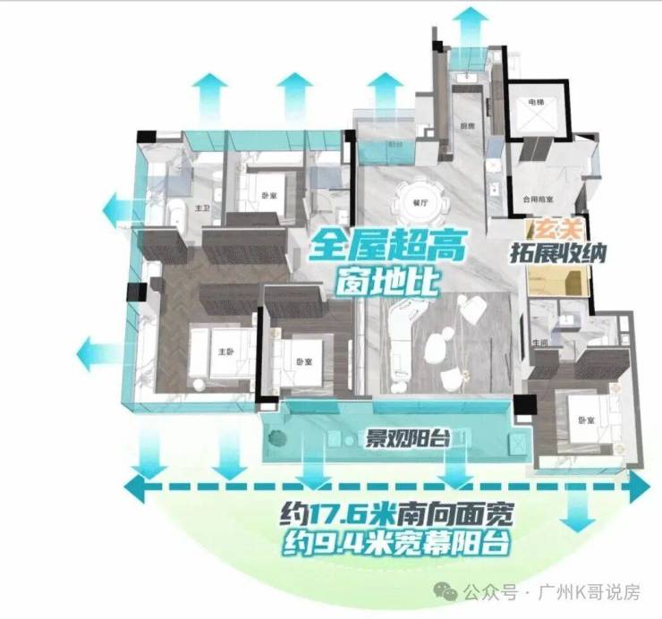 这远超广州常见的0.25住宅窗地比,让业主站在室内的不同位置,都能尽揽美景。