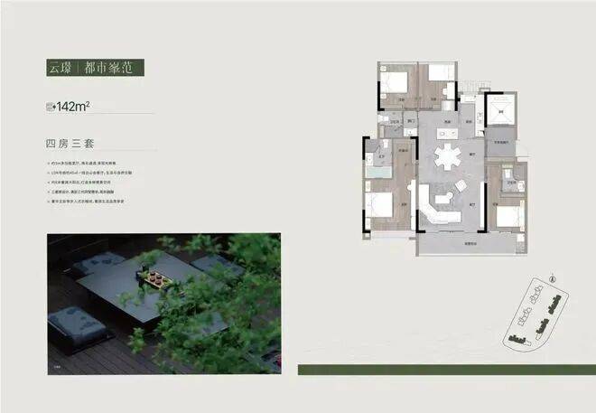 :客厅配备宽景阳台,主卧套房设计,270°观景视野将云山美景引入室内,打造“长在自然里的家”。仅319户的限量规划,确保低密居住体验,匹配高端客群对私密性与舒适度的极致追求。