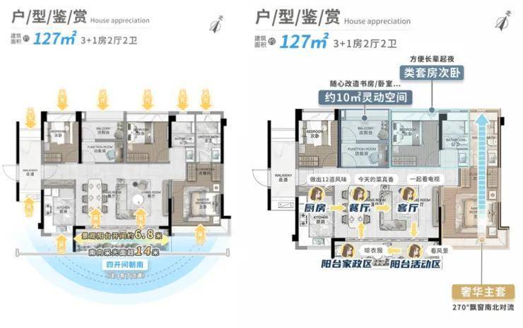 广州城投·岭南府的户型设计非常注重居住舒适性和空间利用率。首推的98㎡三房、125㎡四房和143㎡四房户型,均为全南向设计,确保每户都能享受良好的采光和通风。98㎡的三房户型采用竖厅设计,动静分区明显,主套房配有270°大飘窗,采光通透,适合小家庭居住。125㎡的四房户型则采用横厅设计,南向阳台提供了丰富的景观视野,主卧配备超大衣帽间,特别适合注重居住舒适度的家庭。143㎡的四房户型更为尊贵,南北双阳台设计,四面朝南,确保最大采光面和最佳景观视野,是追求高品质生活的理想之选。
