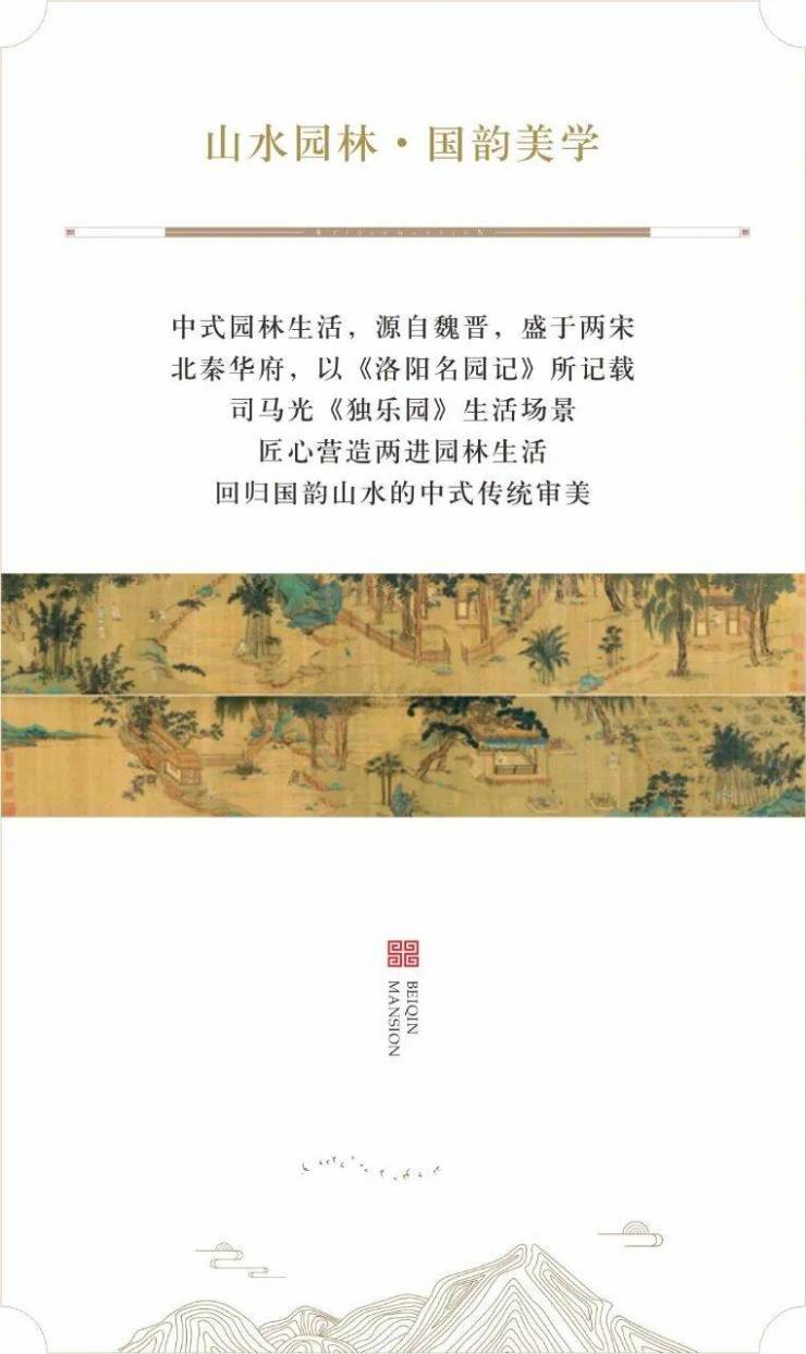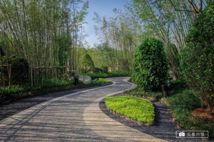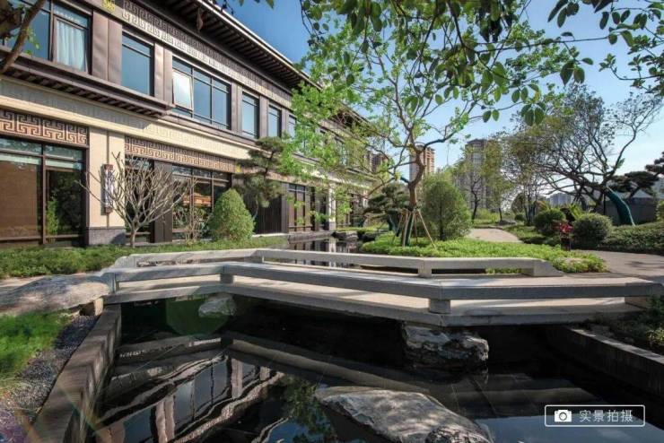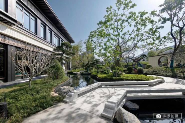 项目园林以环绕式连廊、点景亭台、曲桥竹径,将山水园境串联,归家、入户、观景、会友合而为一,一步一景,归心生活。