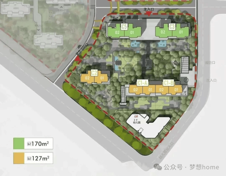 项目因地制宜,把小区西侧的城市公园视野引入社区,打造内院、外园的无界绿色视觉。