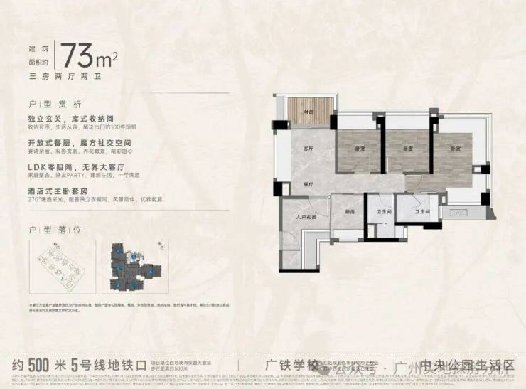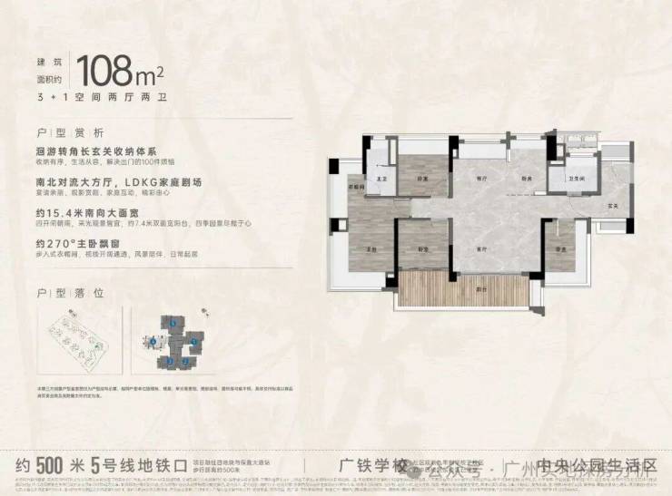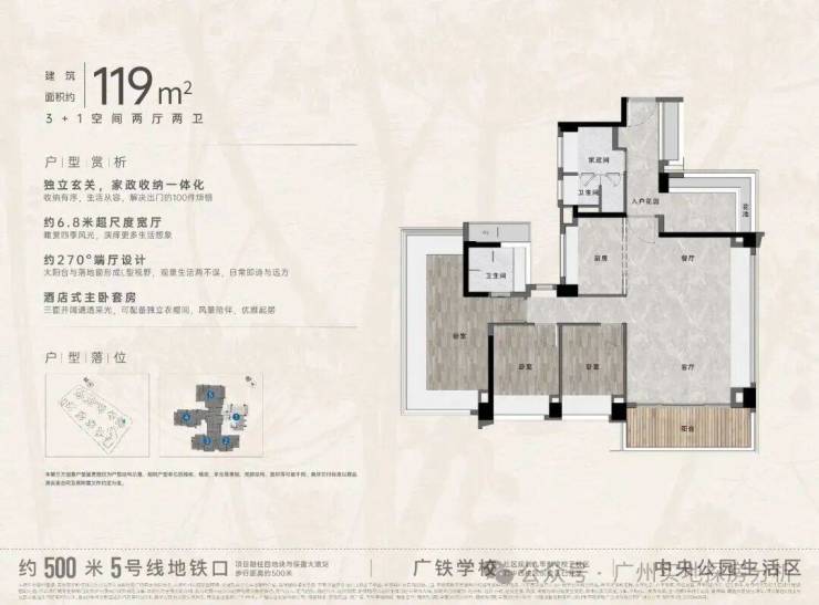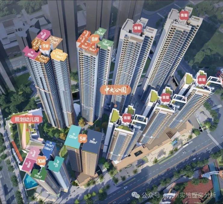 中央公园组团:一共9栋楼,位于整个项目C位,距离地铁约500米,东侧有4万方的大脚印公园,组团北侧就是广铁一中学校与青少年宫。户型涵盖75方.86方和88方的三房,105方.114方.125方.142方的四房。使用率高,加赠送基本在95%以上,2024年底-2025年6月份收楼。