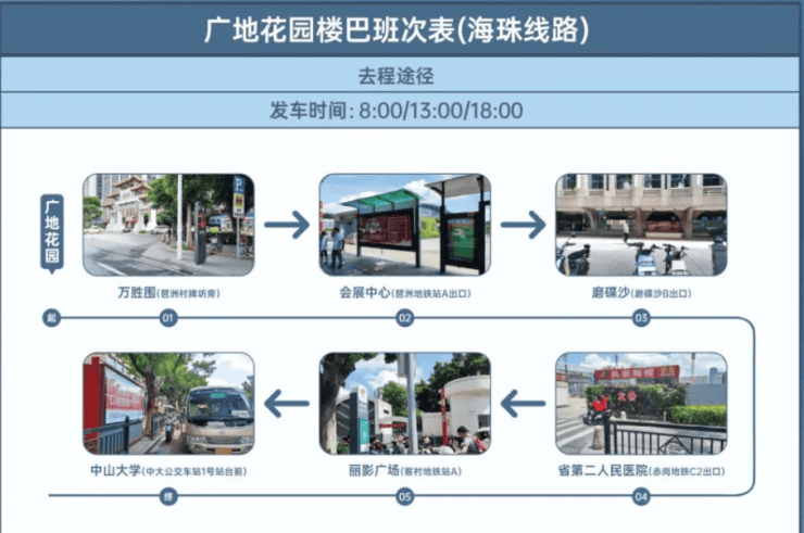 公交方面,小区门口有3个公交车站,广地花园站有2条线路,可达火车站以及地铁站,和塘步西站总共超20条线路,可无缝连接番禺、天河、海珠等地。