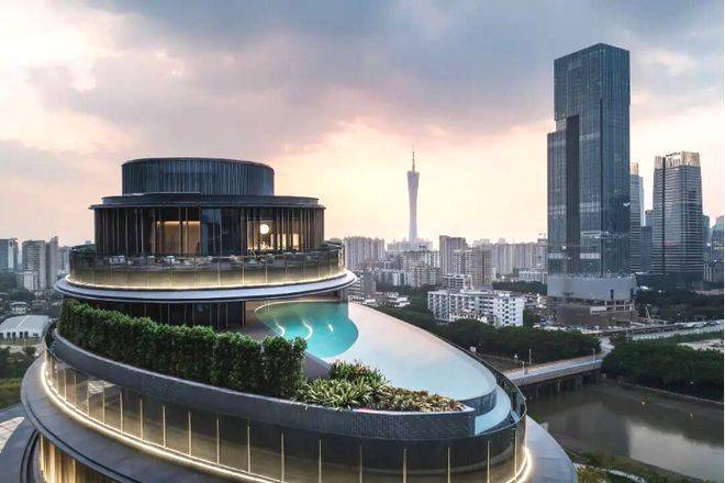 项目以“低密奢居、智能健康、美学落地”为核心,融合现代设计理念与琶洲数字科创、滨水人文气质,打造兼具质感与实用性的顶奢产品[1]。建筑采用现代简约风格,类幕墙外立面搭配高窗地比设计,流体线条与琶洲CBD商务氛围呼应,3.3米层高搭配15-66层差异化楼栋规划,兼顾小高层舒适与高层视野优势[1]。