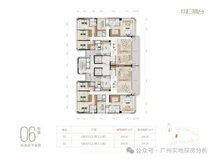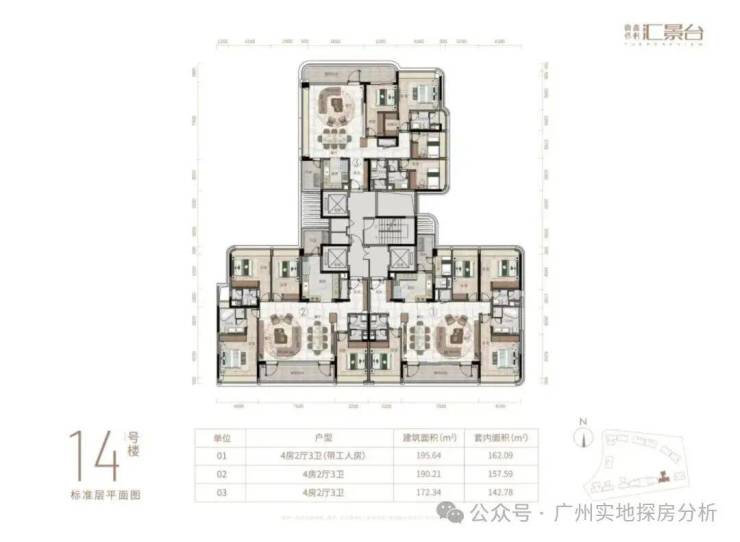 项目由14栋12层小高层组成,涵盖123-352㎡三至五房,共8类户型。