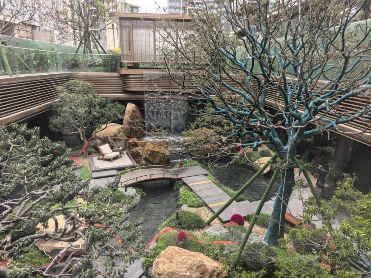 项目紧邻余荫山房(岭南四大名园),另外复刻了岭南园林精髓,飞瀑下沉庭院、清芬阶、玲珑水榭。
