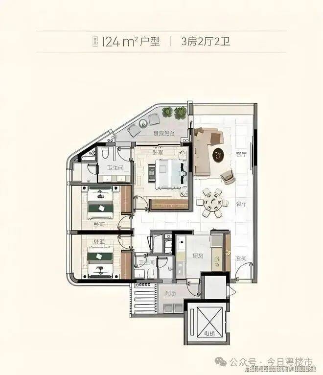 项目由14栋12层小高层组成,产品涵盖123-352㎡三至五房,共8类户型,户型实用率约82-84%