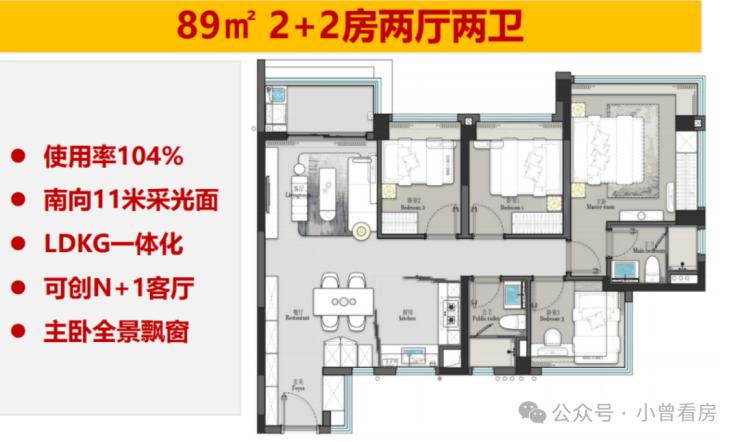 建面约89㎡四房两卫户型,南向采光面达11米,空间开阔明亮