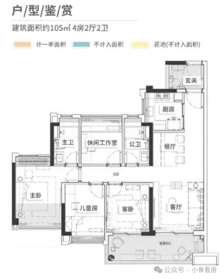 建面约105㎡四房两卫户型,空间尺度充足,功能分区清晰