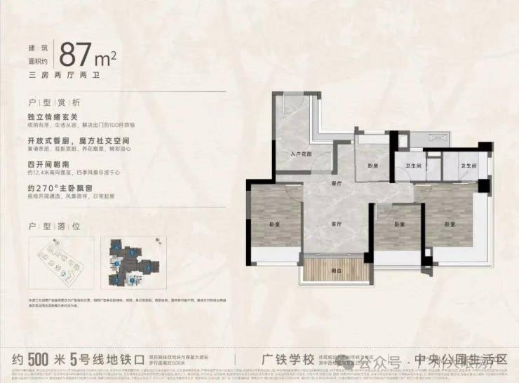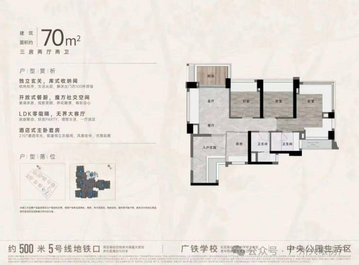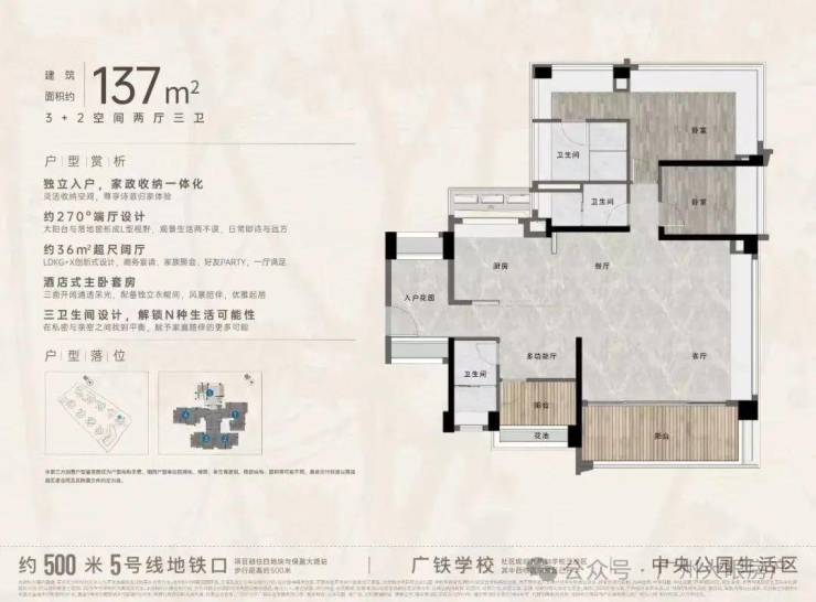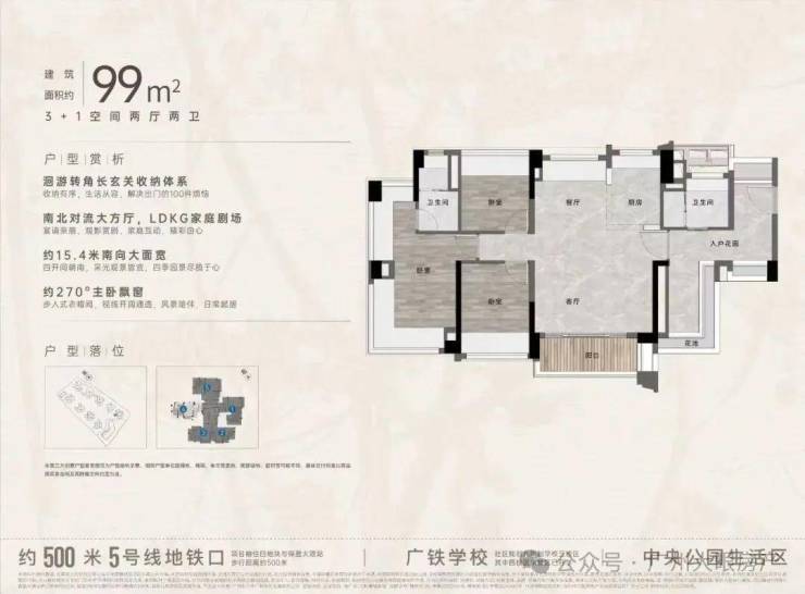 “中央公园”,紧邻大脚印公园,距离地铁约500米,紧邻学校、酒店