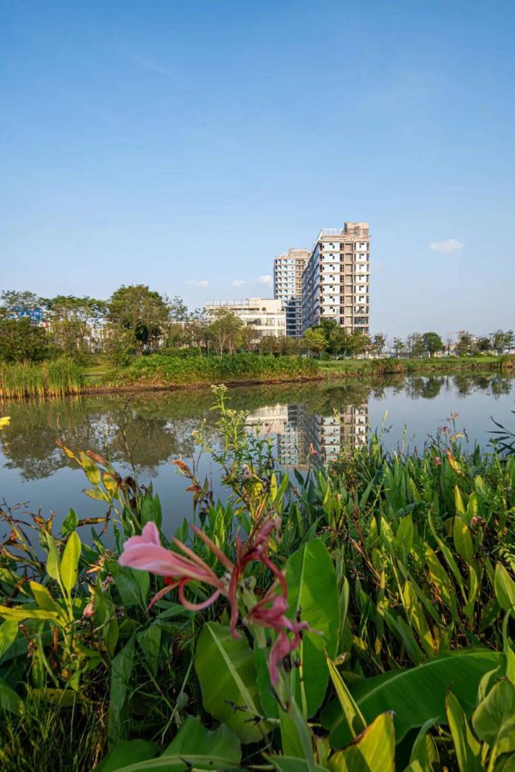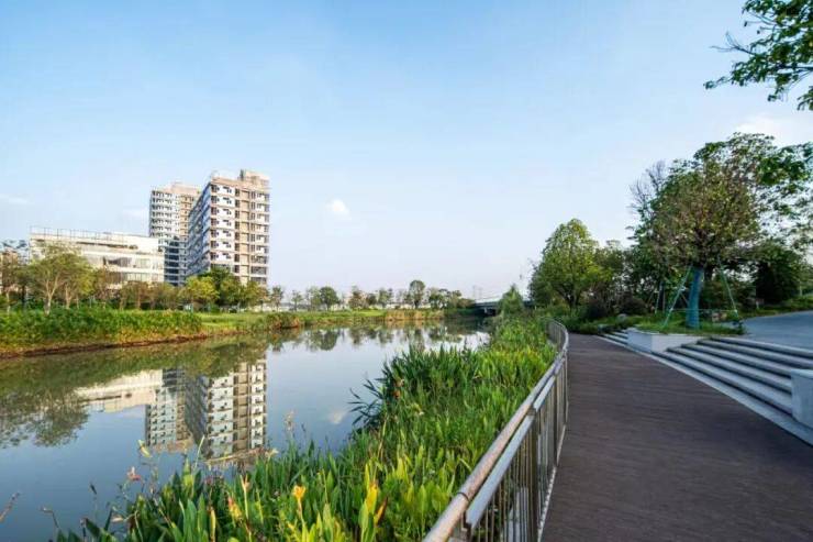 河涌绿地变身社区后花园,代建绿地整合宠物乐园、科普花园、滨河商业功能,通过慢行系统串联住区。住户可沿生态廊道步行至港科大校区,实现“校门——家门——园门”十分钟生活圈。