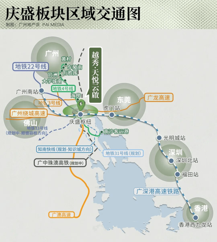 作为《南沙方案》三大先行启动区之一,庆盛是内地唯一双高铁同时直达香港西九龙和澳门的区域,其中,最快通达香港的交通枢纽——广深港高铁,南沙境内只在庆盛设站,从庆盛到深圳福田仅半小时左右,到香港西九龙,仅需约50分钟。未来更有广珠澳高铁在此设站,能使庆盛在30分钟内,与广州中心城区、中山、珠海、澳门直连互通。