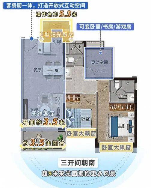 四开间朝南布局 ,拥有约12米 宽幅采光面, 客 餐厅一体联通南向宽幕阳台 , 延伸居家空间尺度,U型明厨设计动线流畅有序,星级主卧套房配置独立卫浴,更 预留灵动空间 ,延展生活所想,为兴趣与成长留白一方专属天地。