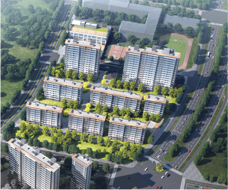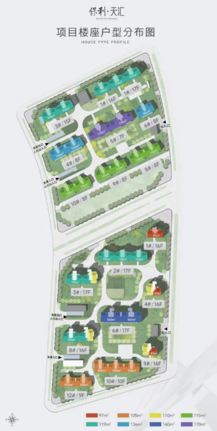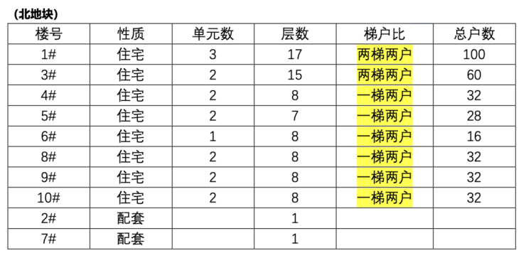 北地块南侧规划为7~8层洋房,北侧规划为15~17层小高层,采光充沛,户型面积有115/119平米三居,136/170平米四居,南北向间距在约40~44米之间。洋房产品一梯两户,高层产品两梯两户,南北通透,得房率高。