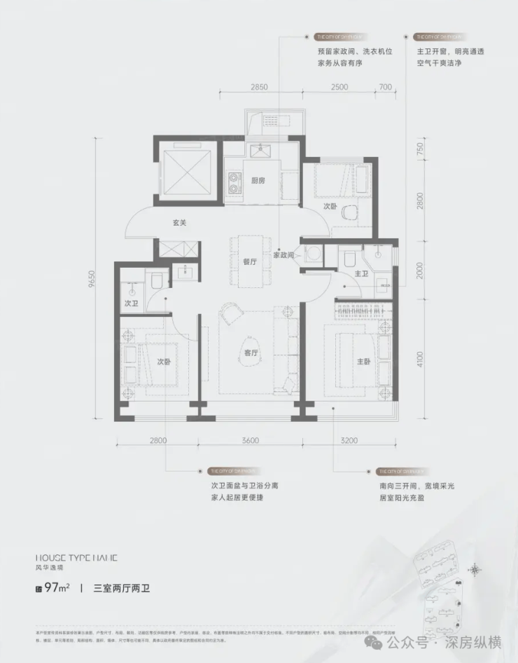 南地块最南侧规划2栋9~11层洋房产品,北侧规划为16~17层小高层产品,户型面积97/105/110/119平米三居和160平米四居,楼间距约46~67米之间。洋房产品一梯两户,高层产品两梯两户,南北通透,得房率高。