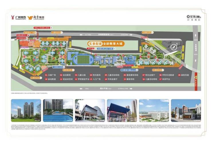 社区内学校:社区内配建27班公办幼儿园和45班九年一贯制公办广外附,均已开学(具体招生条件、招生范围及开班数量以教育部门公布为准)