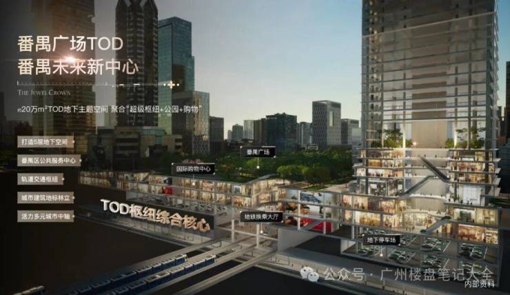 📌番禺未来新中心:番禺广场板块被定位为番禺区公共服务中心和轨道交通枢纽,打造为以交通枢纽、行政办公、文化休闲、商业商务等功能为主导的番禺未来新中心。番禺广场地下规划5层约18万㎡空间,对标花城广场打造“地下商业+地上公园”发展模式,未来承载千万级客流。