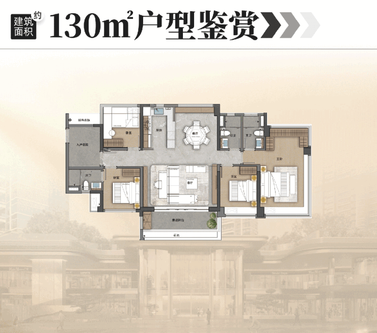 还不错的还有,130㎡户型,可以做到5空间和双主套设计,把以往要160㎡以上才能做到的双主套用更少的面积做到了。