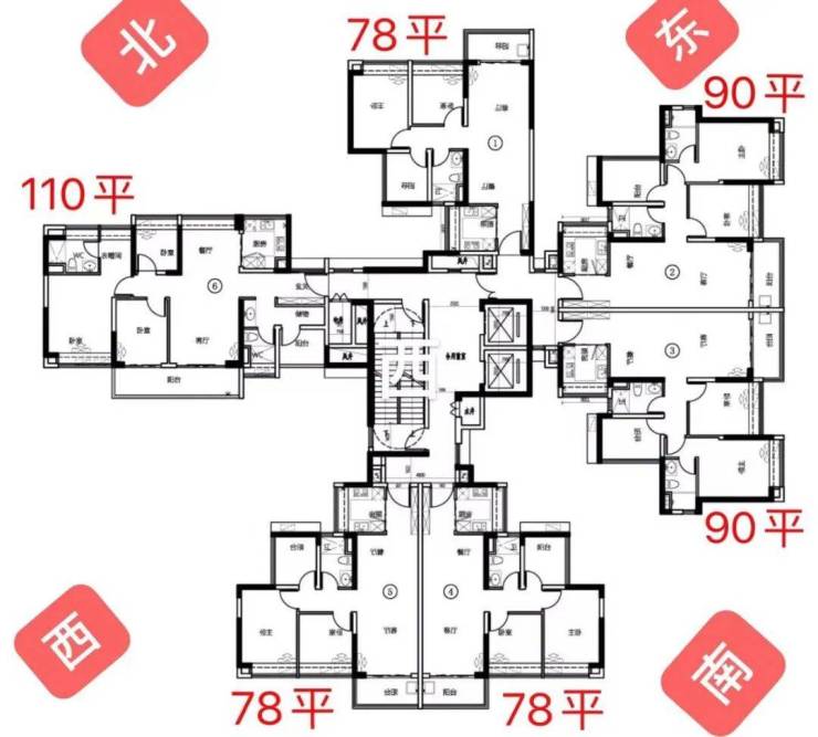 产品方面,面积段有建面约78㎡-110㎡的三至四房,两梯六户设计,28层。梯户比相对一般,但户型从样板房的实测观感来看,做的不错。