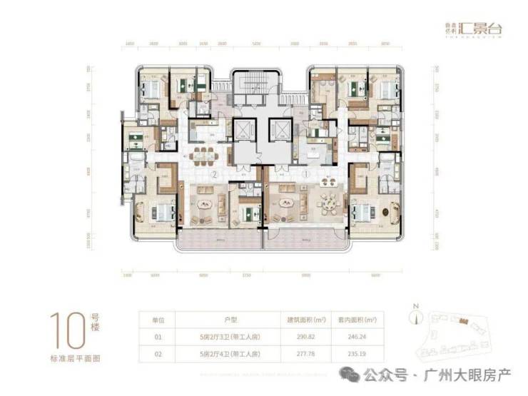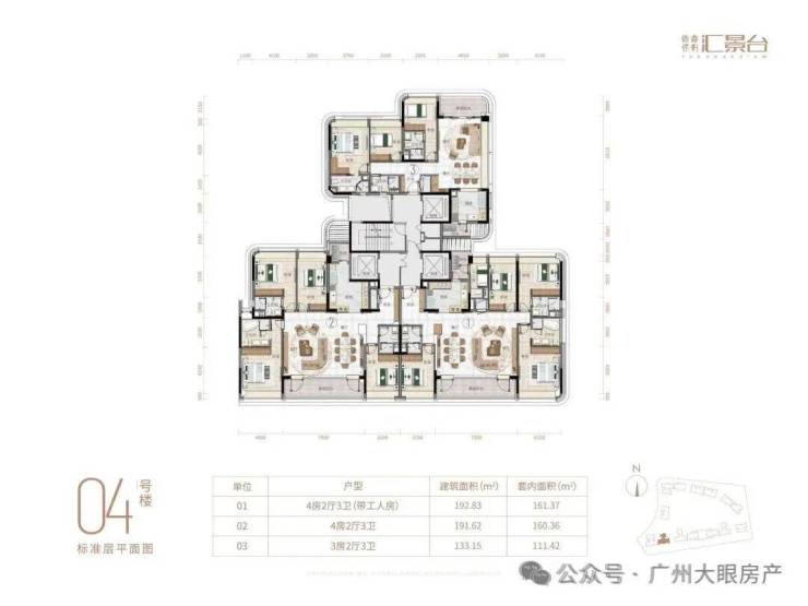 项目由14栋12层小高层组成,产品涵盖123-352㎡三至五房,共8类户型,户型实用率约82-84%