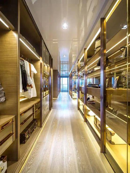 主卧衣帽间设计师汲取国际时装秀T台灵感,合宜的运用空间配置及光线铺陈,采用温润的木质元素结合质感透明镀膜的玻璃,塑造起空间的温度,并籍由精心营造的个人时装Show休闲氛围。
