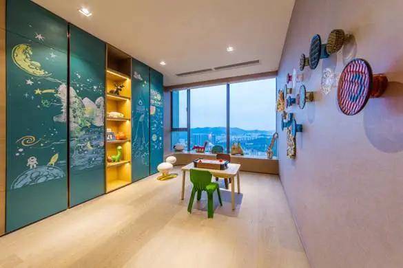 儿童房别出心裁的设计,犹如置身梦幻的童话世界,露宿于星空下的童话森林,彰显活力与想象力。与之相连的玩具室是给业主的独有尊贵设计,可以亲子互动同乐,聘请私教寓教于乐。