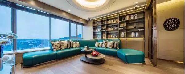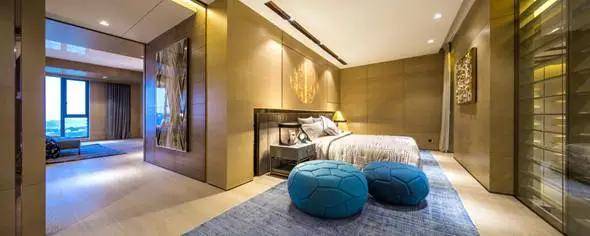 空中会客厅约6.5m高,为使业主真切感受“南湖”与“星空”的浪漫,设计中运用了大面积的落地玻璃。“湖水”则以流线型的墙面装饰配合灯光的变化来演绎,搭配电视墙身金色摆饰,与入户的星星吊灯风格一致,使整个空间融为一体。