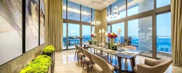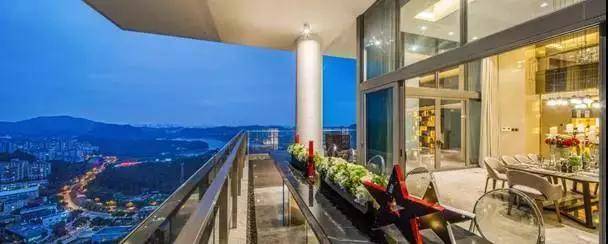 餐厅外是270度超宽观景阳台,使用回廊式全落地玻璃窗,空中水吧搭配星辰主题灯具,就像置身在星空世界中,与自然相融。