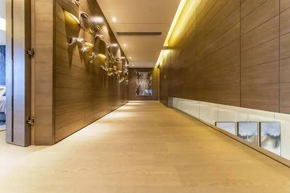 步入二层休息区,温润的原木色墙面上以一组生动的银鱼造型装饰,寓意主人家连年有余,吉祥如意,走廊尽头的挂画无声的映衬着墙面的生动。