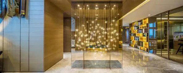 餐厅约5.5m高,墙身使用树枝水晶面板,并选用西班牙灯具品牌VIBIA “光之雕塑”概念吊灯,简约的线性设计,在夜晚下发出点点繁星照耀着整个用餐区。