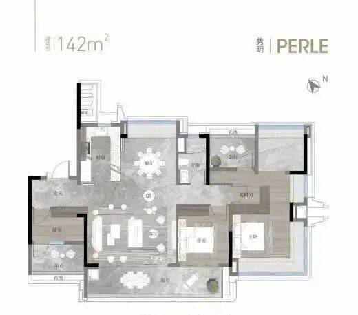 建面约142平方米户型:货量最多,独梯独户板式设计,三面采光,餐客厅和主卧南北对流。