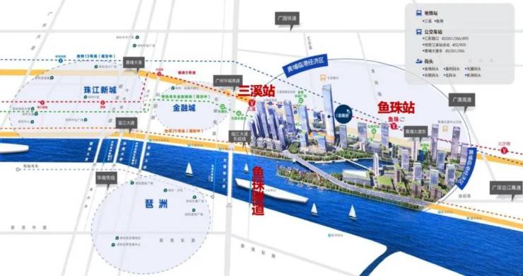 5号线三溪地铁站+5&13号线鱼珠地铁站,临珠江畔;临江大道主干道直达,百万人流触手可及
